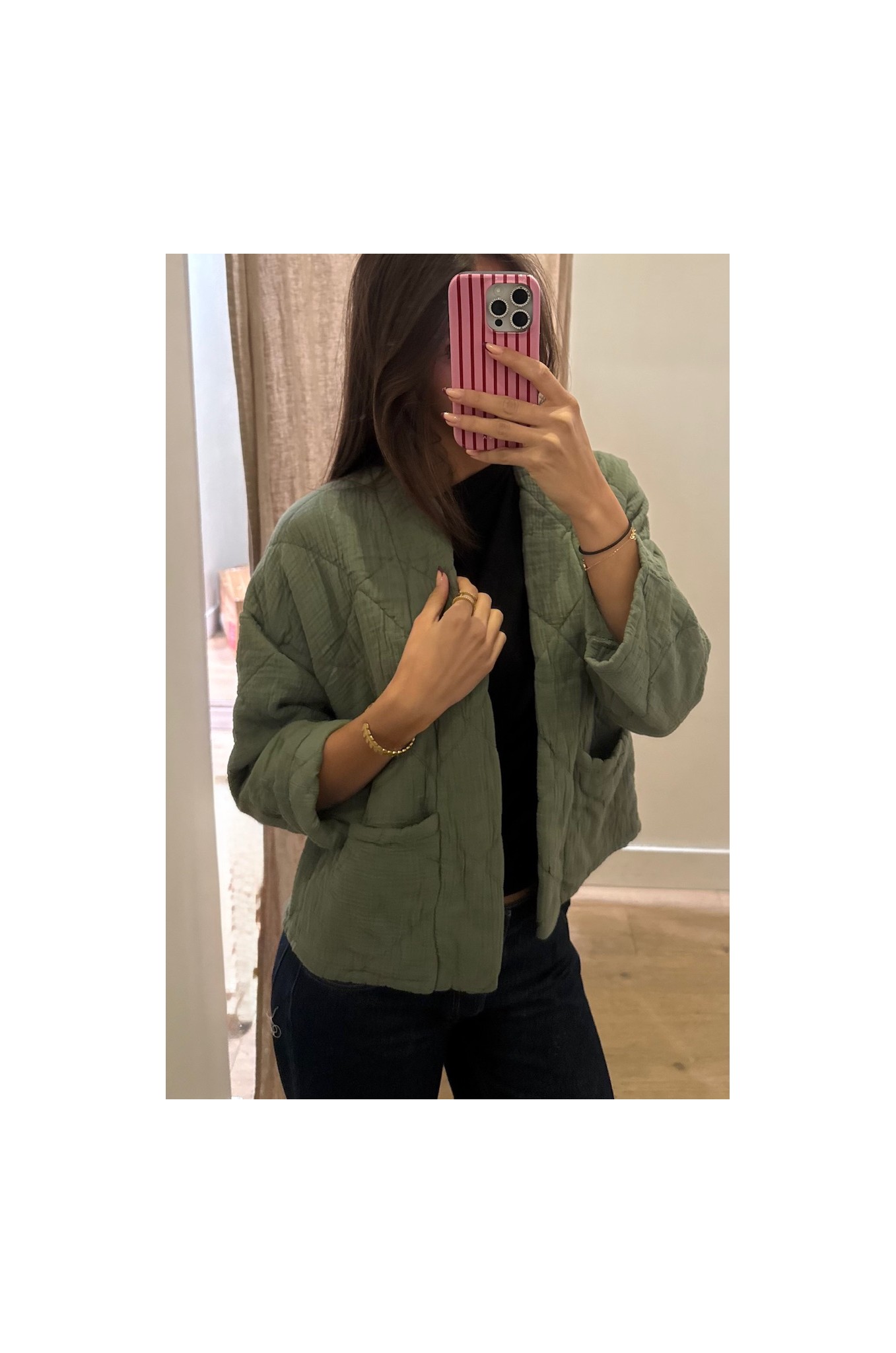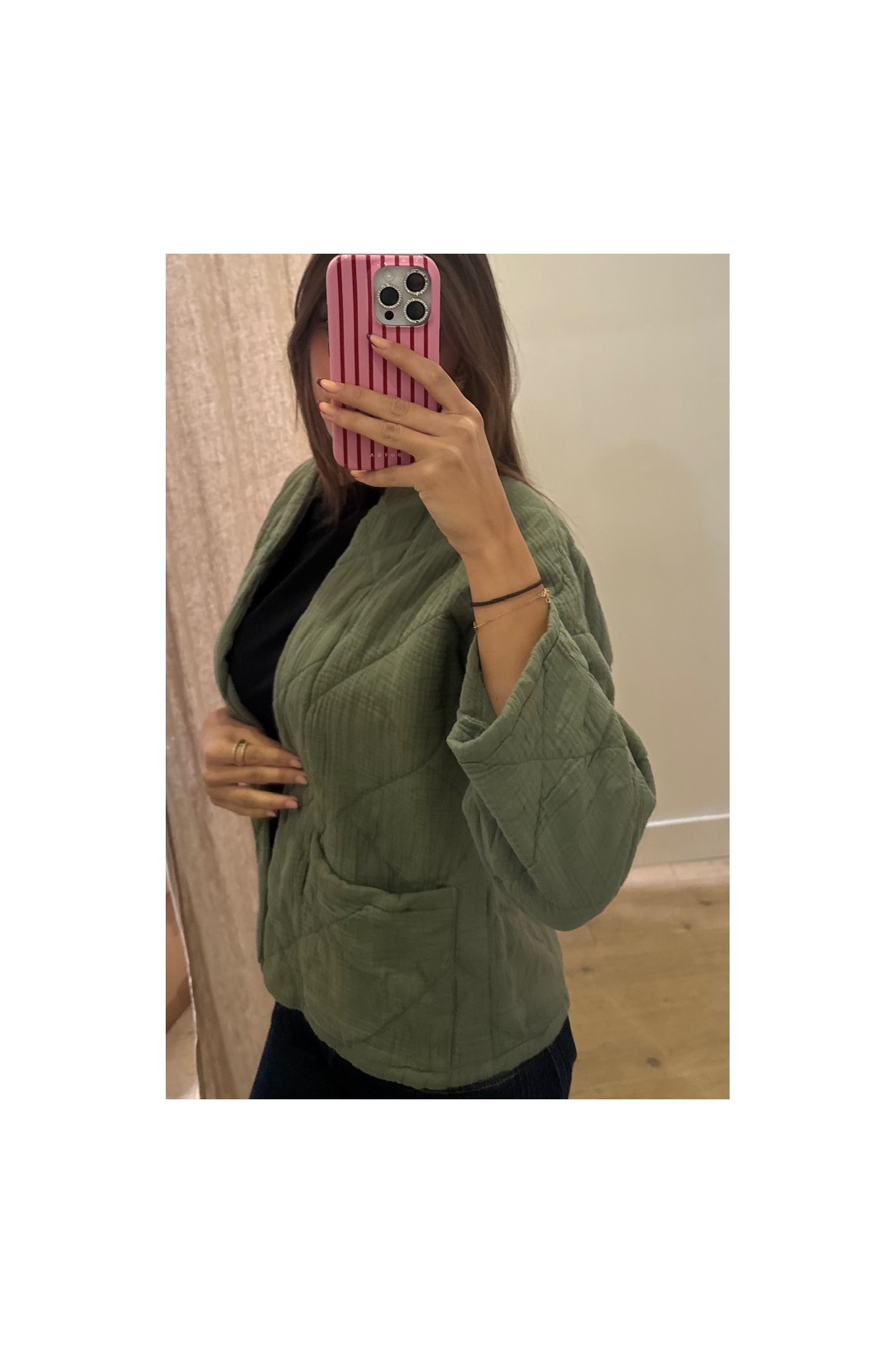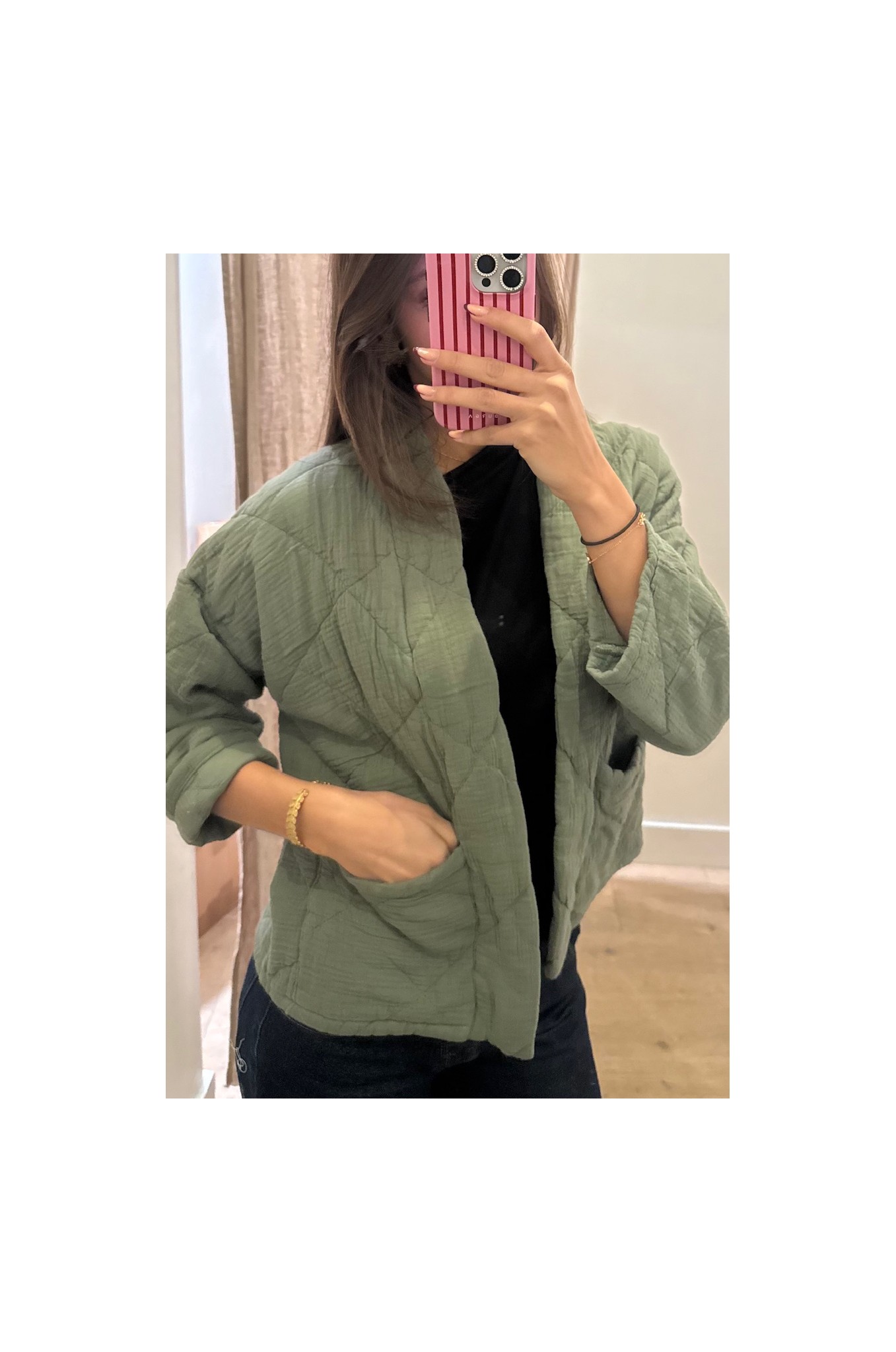 Apportez une touche douce et tendance à votre tenue avec ce kimono court matelassé rose.