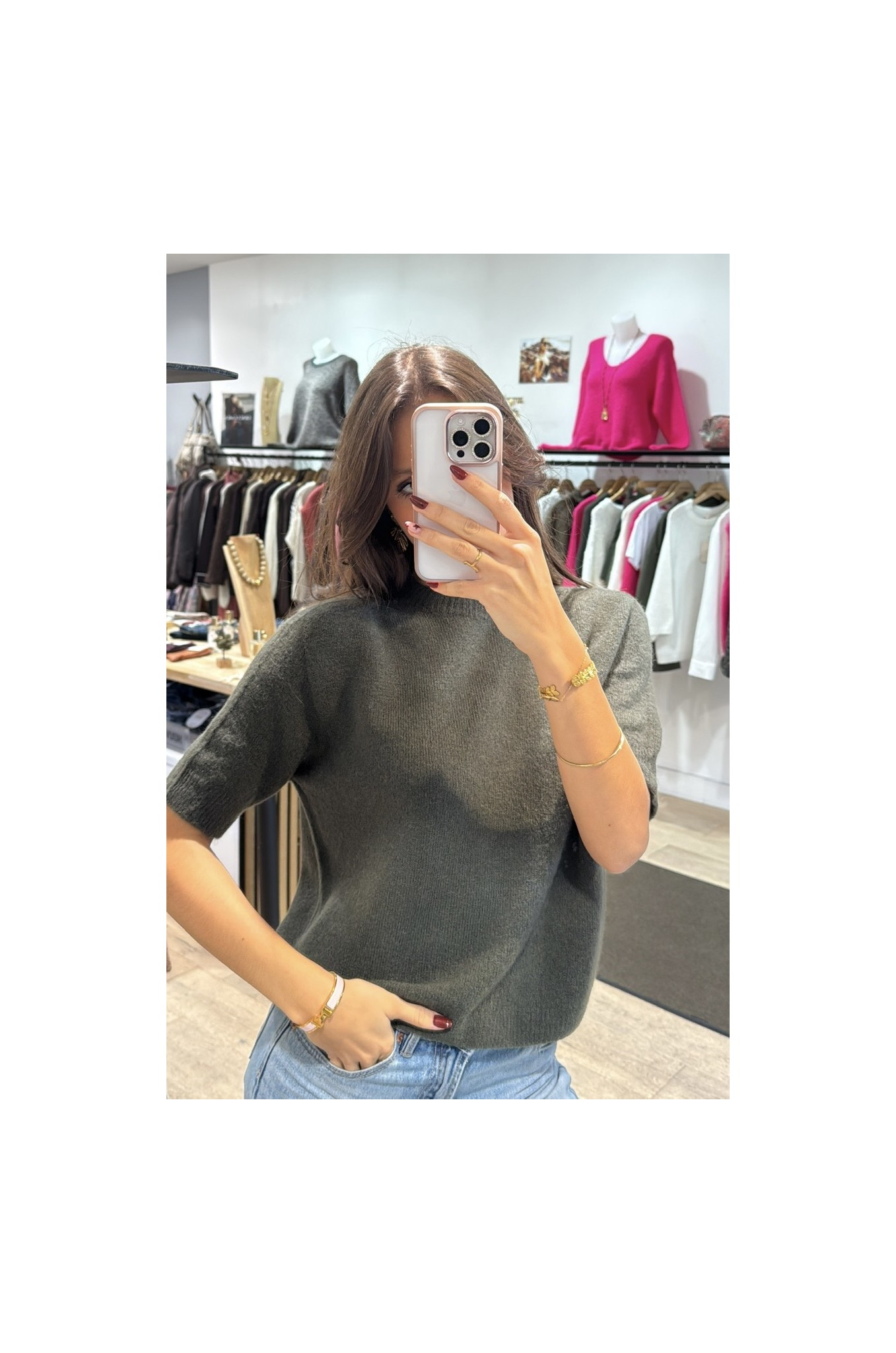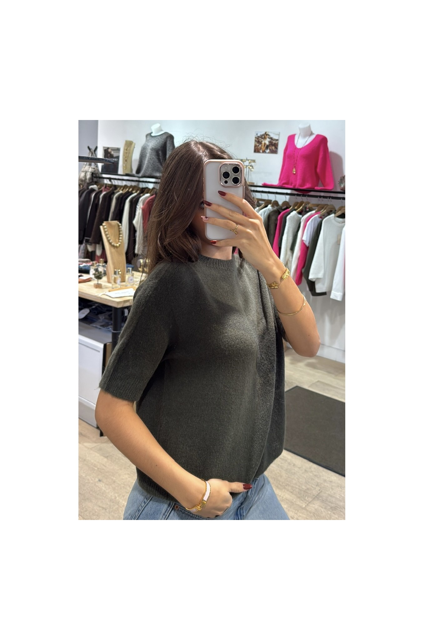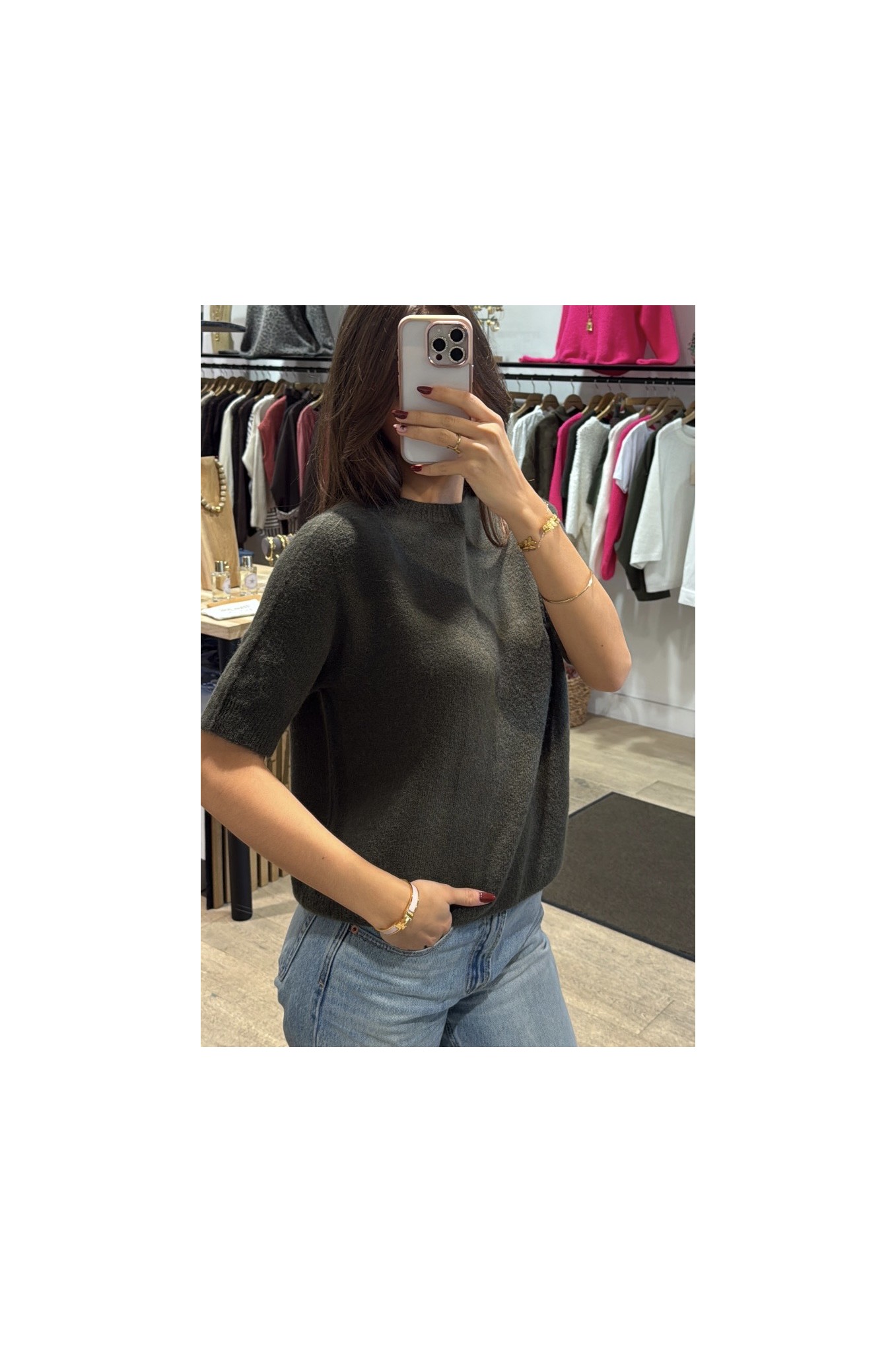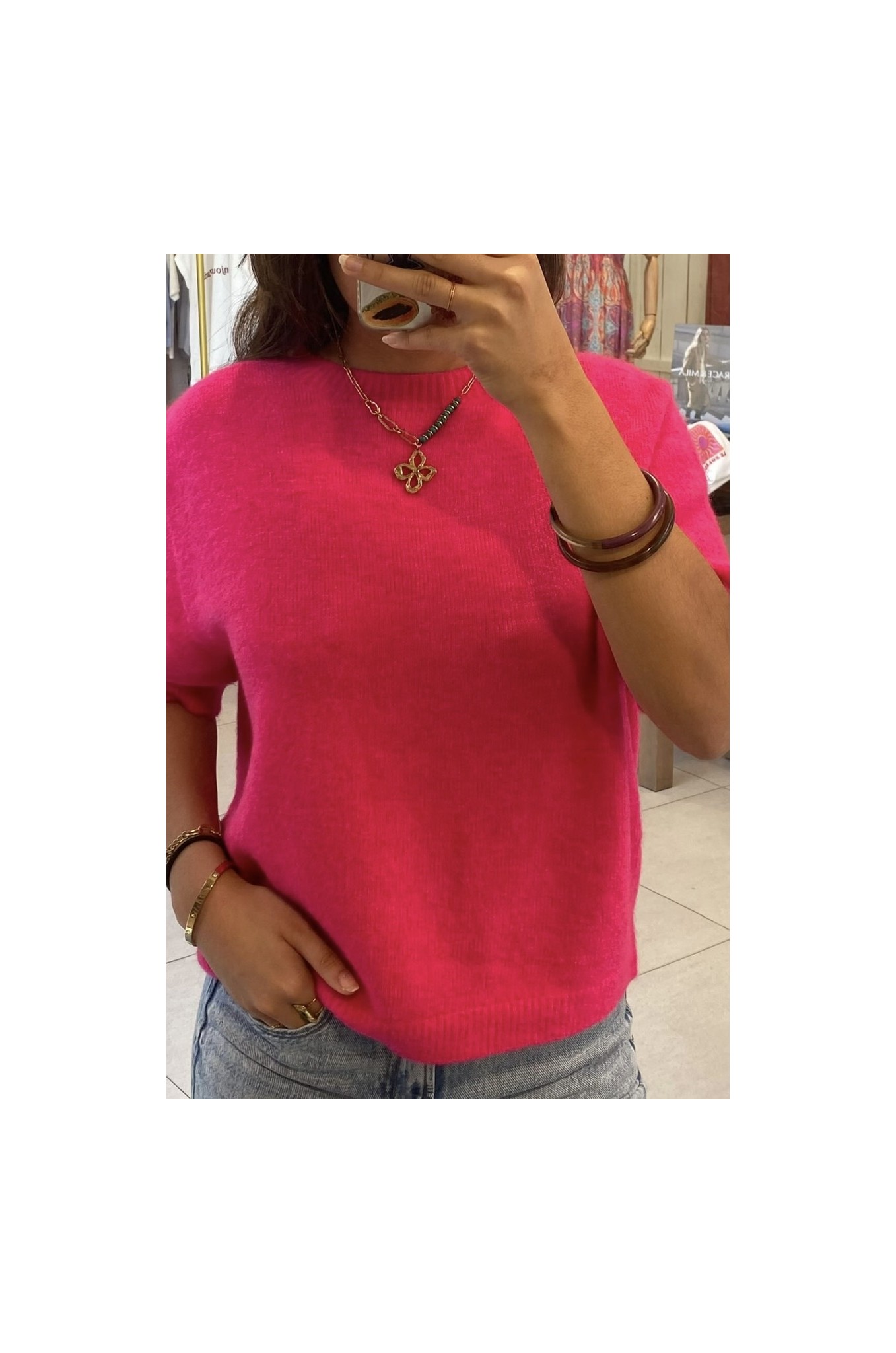 Le pull NOÉMIE est un modèle en manches courtes, encolure ronde , en taille unique convient d’une taille 34 au 40
