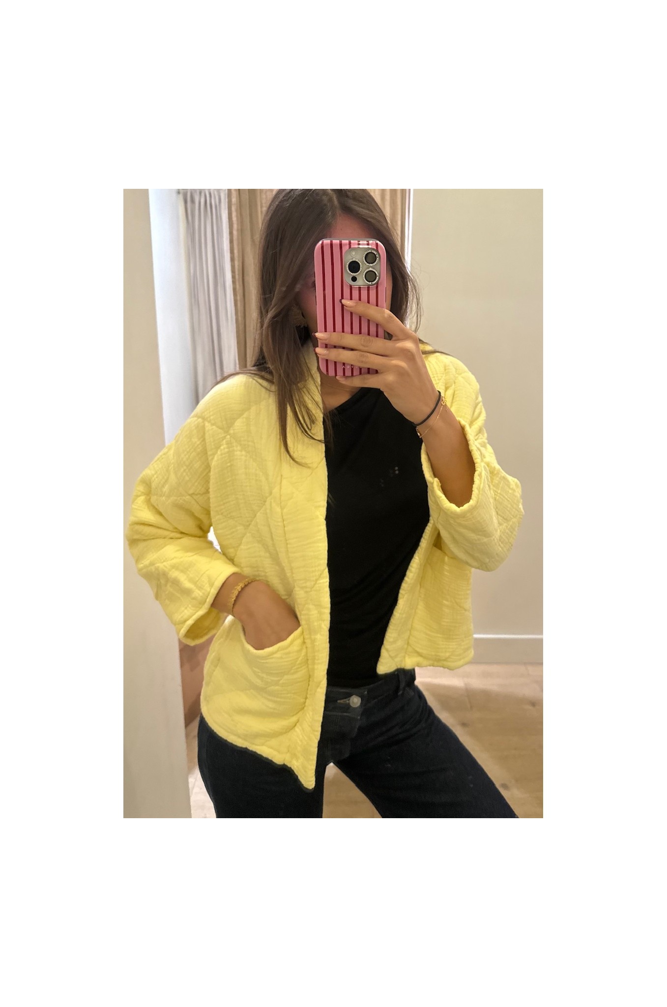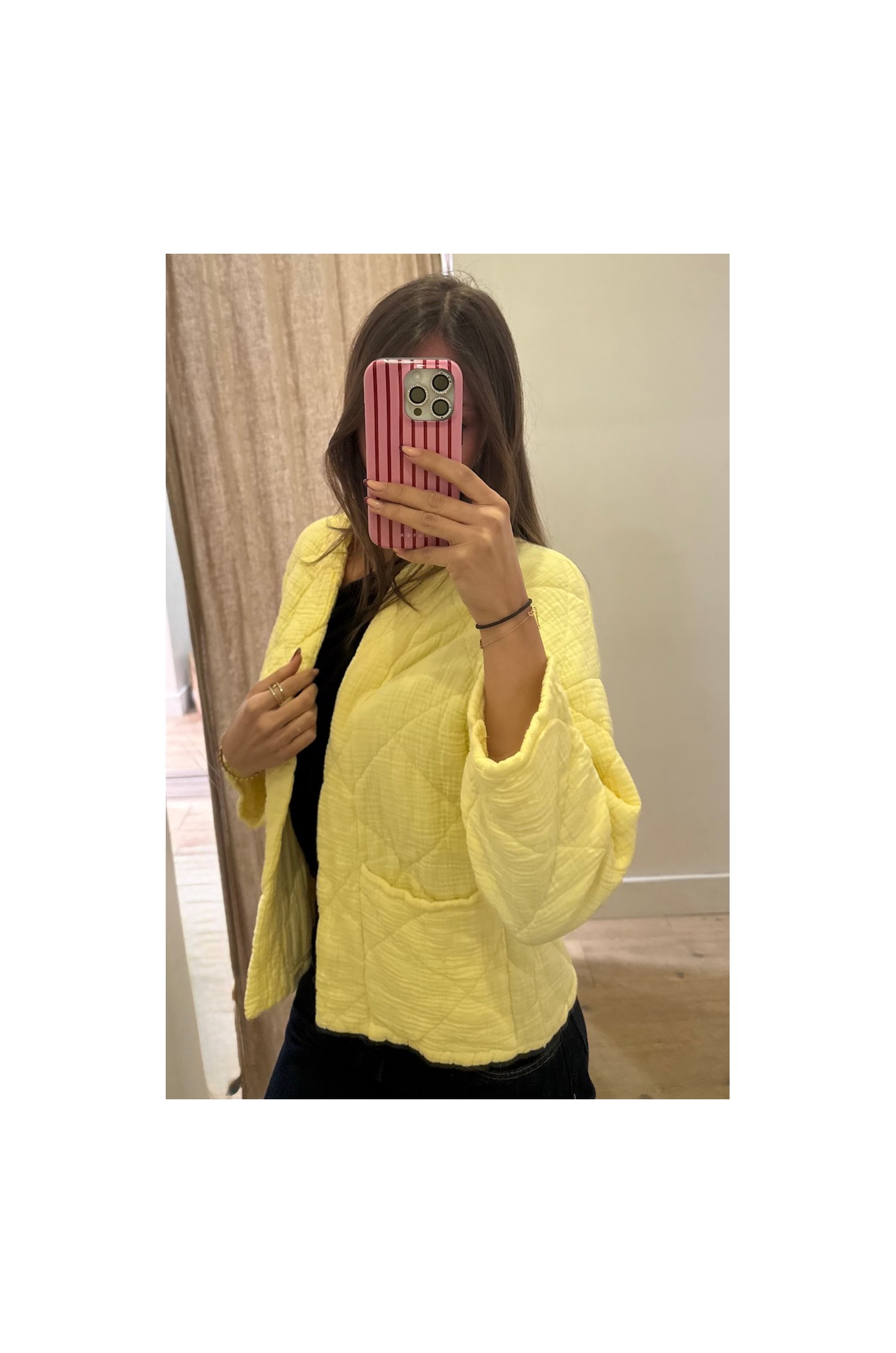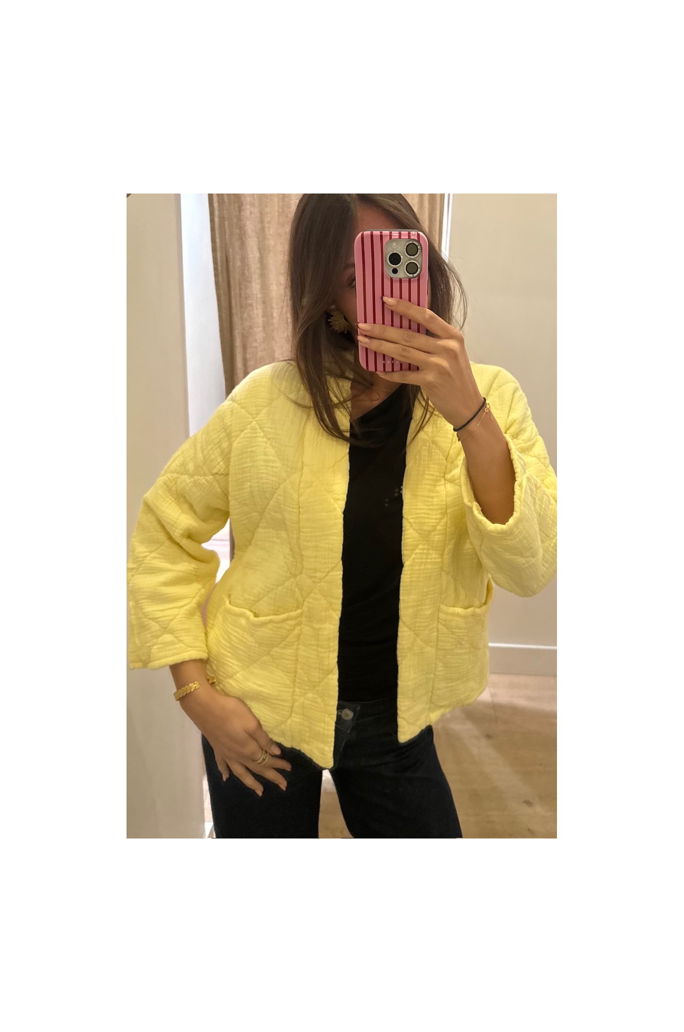 Apportez une touche douce et tendance à votre tenue avec ce kimono court matelassé jaune.
